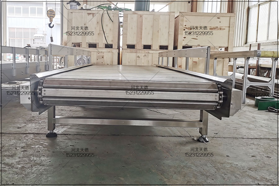 4、傳動鏈條合理布局純真,傳動鏈條能夠在一條輸送機上進行水準、歪斜和拐彎運輸。