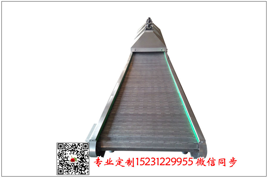 對于網帶輸送機的不銹鋼輸送帶而言有足夠的強度。不能以低強度不銹鋼輸送帶代替強度金屬輸送帶。在網帶輸送機上的拉緊裝置中,裝設位置限止器。自動拉緊裝置起升到一定的位置時,保證自動切斷起升電源,并給出禁止起升信號。當自動拉緊裝置下降到的位置時,要自動切斷下降電源,并給出禁止下降信號。