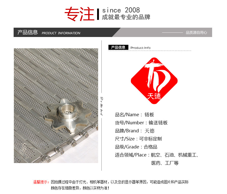 天德溫馨提示:輸送鏈板是定制產品,規格及報價會根據板厚、節距、串桿直徑、材質、寬度、長度來計算,親 也可以告訴我們使用要求、應用環境、每米載重量,由我們來幫您推薦定制數據,盡力做到定制的產品即夠用也不浪費。