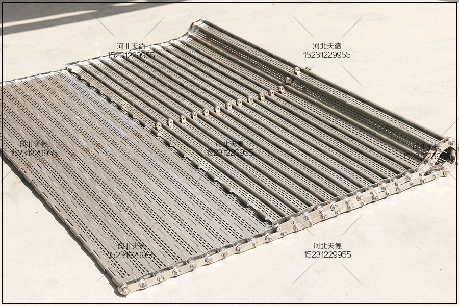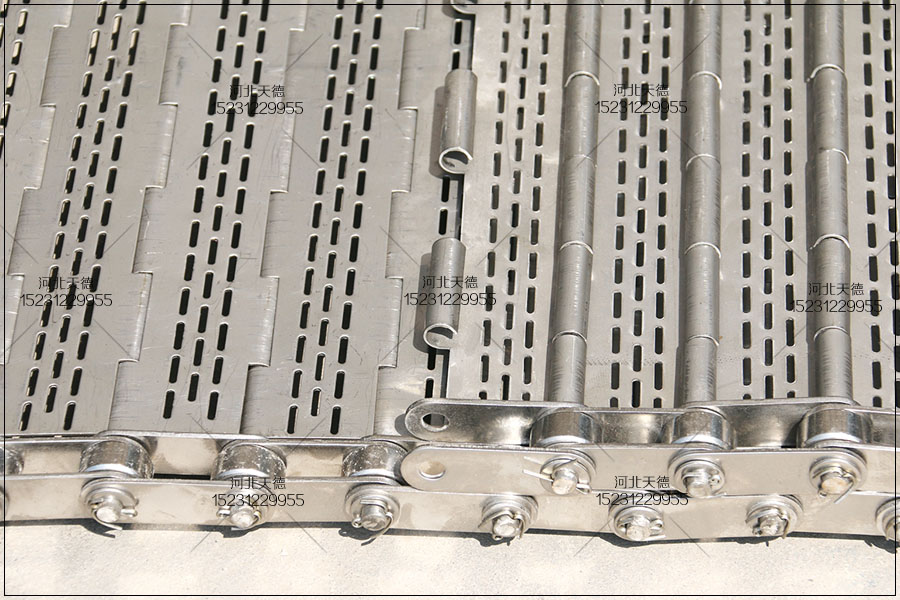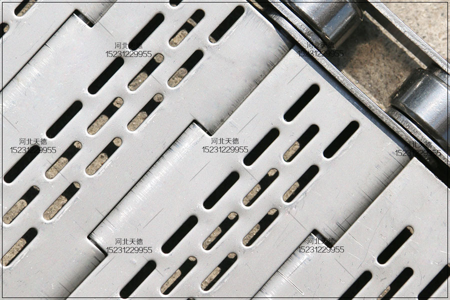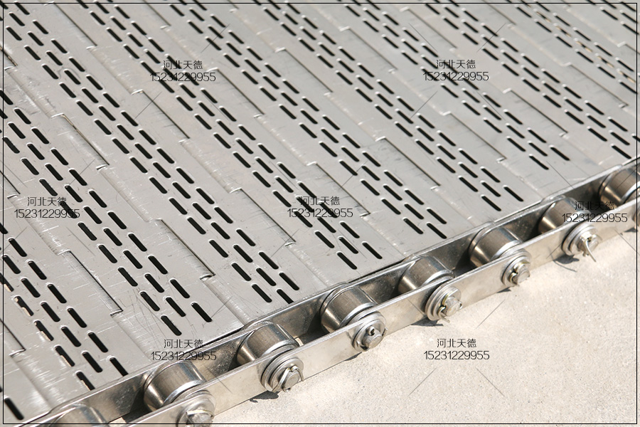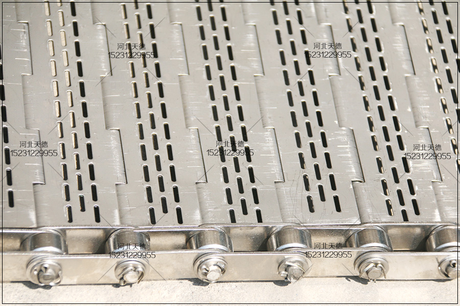 采用不銹鋼304材質板材,鏈板不銹鋼輸送帶的中 心 距為560毫米,鏈條節距為38.1毫米,桿直徑為8毫米