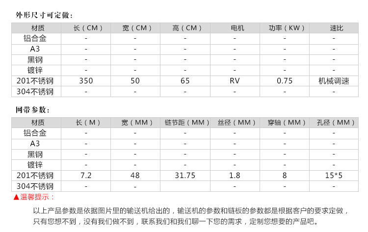適用范圍:廣泛應(yīng)用于飲料瓶、鋁罐、藥品、化妝品、食品等行業(yè)的輸送,通過(guò)選用不同的網(wǎng)帶可以制作成儲(chǔ)瓶臺(tái)、提升機(jī)、殺 菌 機(jī)、蔬菜清洗機(jī)、以及肉食品輸送等行業(yè)專用設(shè)備。考慮網(wǎng)帶承受拉力限 制,單線長(zhǎng)度一般不超過(guò)20米。